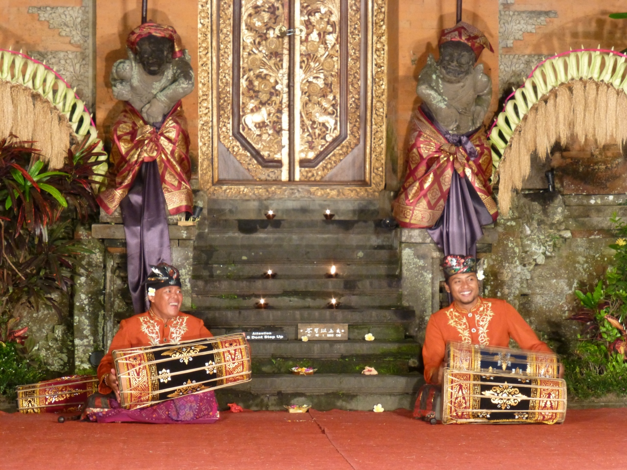 ウブド1日ツアー参加の際「今晩のバリ舞踊は何を見る?」と問われ、その場でレゴンダンスを選びました。開演は19:30からでしたが、18:00頃から会場には人が集まりはじめ、あっという間に満席になりました。良い席を確保するには早めに行った方が良いと思います。開演を待っている間に雨が降り出しましたが、開演の頃には辛うじて止みました。雨の場合は、屋内ステージに変更になることもあるそうです。公演時間は1時間半くらいでした。