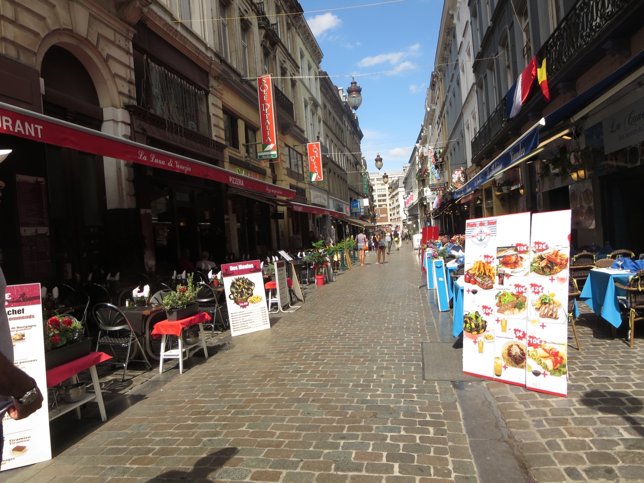 通り沿いにレストランがたくさんあって、レストラン街になっています。ベルギーの名物料理を出す店海鮮料理を出す店、フランス料理屋などが中心でした。レストランに入る際には、メニューをよく見てから入った方がいいです。観光地化されているため、周辺の店よりも若干高いことが多いです。