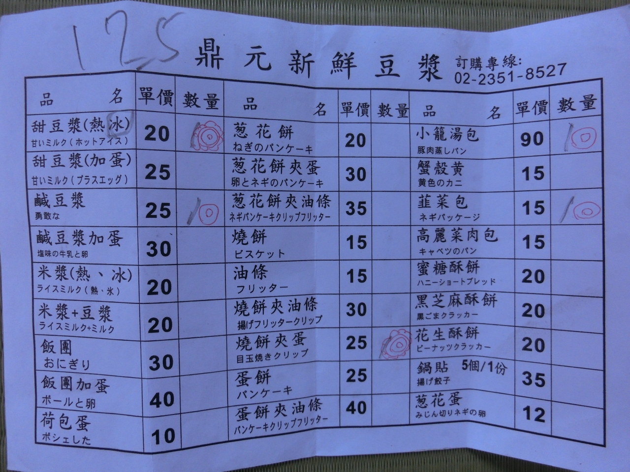 予めブログなどでおすすめのお料理を予習して行ったのですが、「内用」カウンターで書く真似をしたら、日本語付きの注文用紙をくれました。