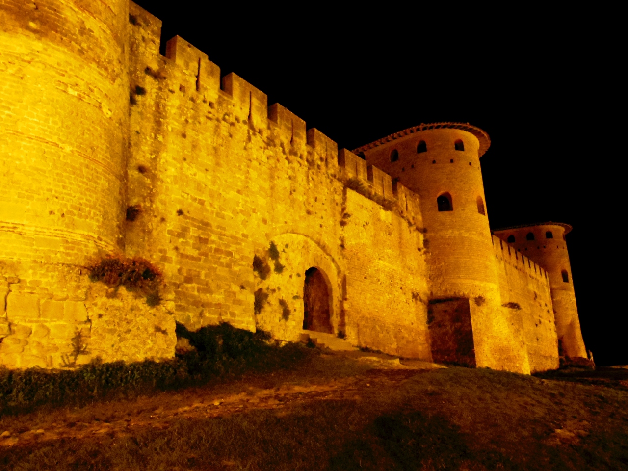 カルカッソンヌのシテの城壁の内側に入る入口はたくさんある。城壁内に入るのは無料。城壁は世界遺産に登録されている。グルっと一周している城壁は巨大で手前の橋から見るとその大きさがよくわかるだろう。夜は夜景が楽しめる。