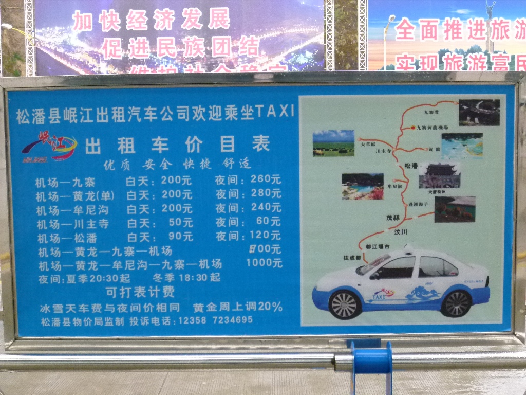 ツアーではなくフリーの旅のの醍醐味はいろいろありますが、スリルもなかなかです。九寨溝空港内でタクシー乗り場を案内され駐車場へ行くと乗り合いワンボックスに乗るよう指示を受けました。さすが利用客は皆さんツアーのようでタクシー利用者がいませんでした。行先によって一定額が定められていると聞いていたのですが、全く違っていました。確かに空港から山を下る途中の空港敷地を出たところで突然、降ろされ別のタクシーに乗るよう指示されました。しかし九寨溝までの道程でホテルで休憩してお風呂に入って買い物するよう勧められ、断ったのにもかかわらず如何わしいところへ案内されました。最悪です。気をつけましょう。