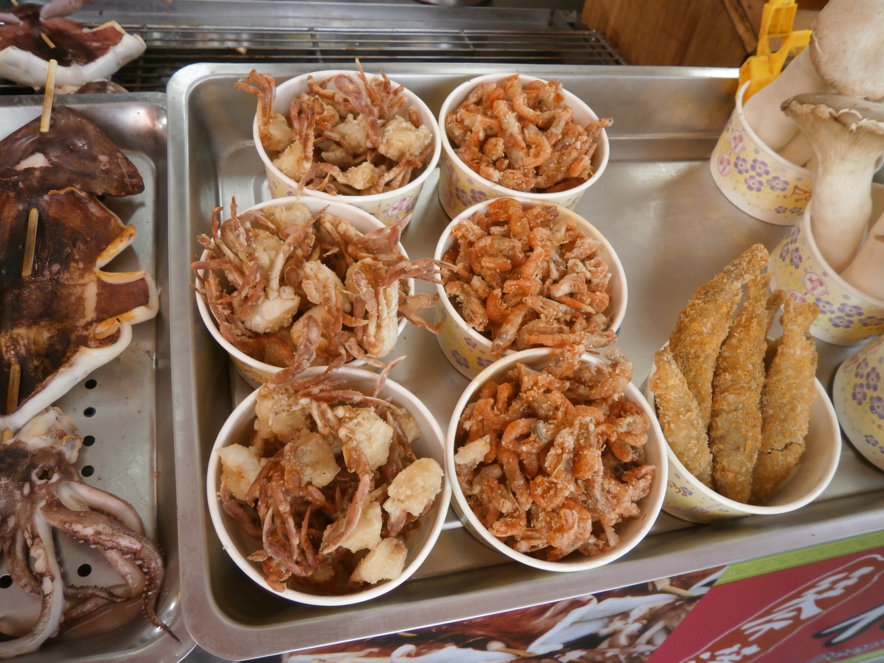温泉に入ってから淡水について、お昼食べたいとブラブラと歩いていると、カニの唐揚げ、イカの唐揚げ、イカの姿やきがる屋タイが目に入り、早速注文