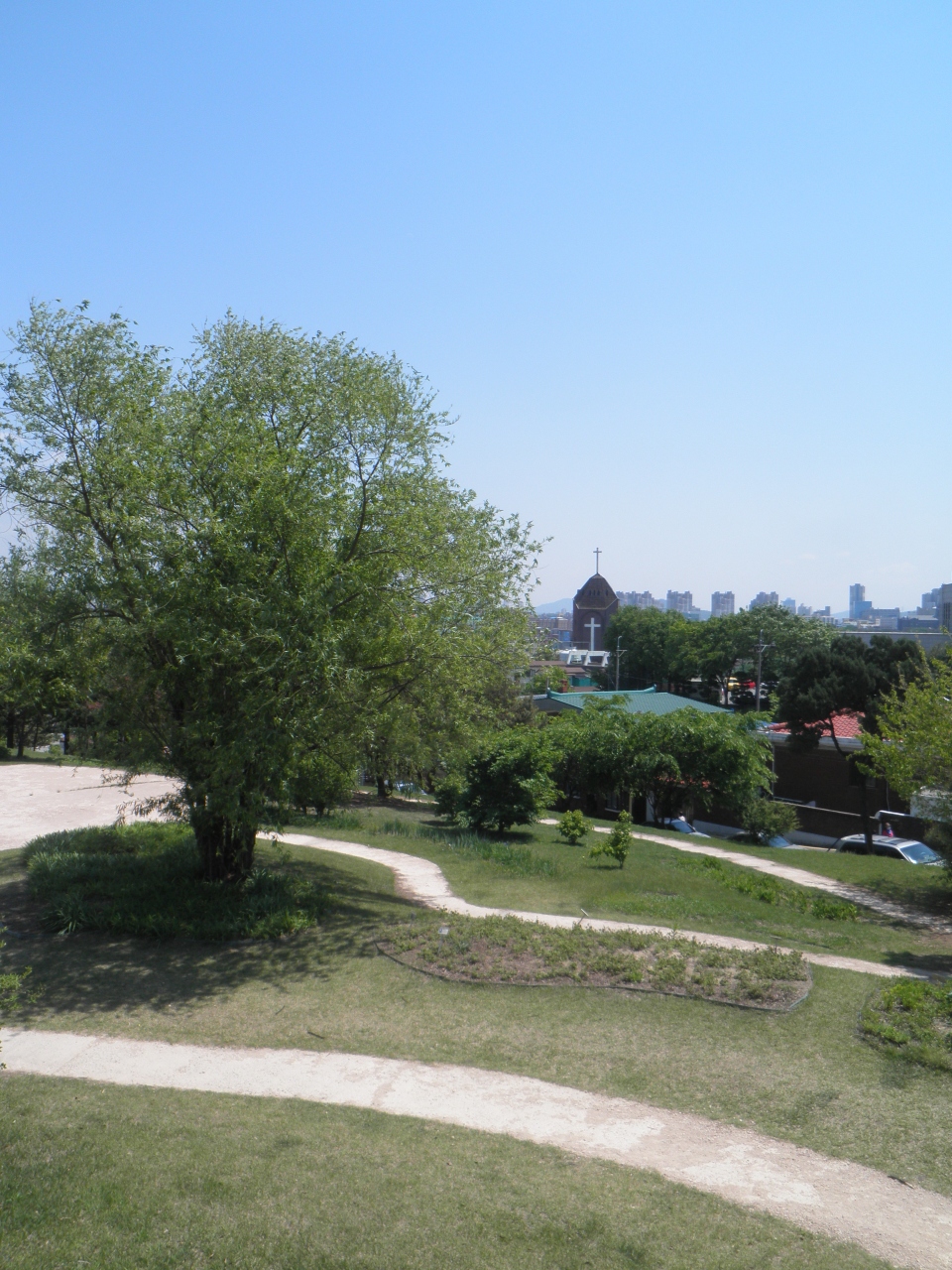 水原華城の西北角楼は、周辺に芝生が多く、距離の長い城壁めぐりのとき、休憩することができました。近くにレンガい色のちいさな教会堂がみえたり、あちらこちらに白い旗がはためいていました。夏に城壁めぐりをするときには、飲料水と日焼け止めを持ち歩きました。