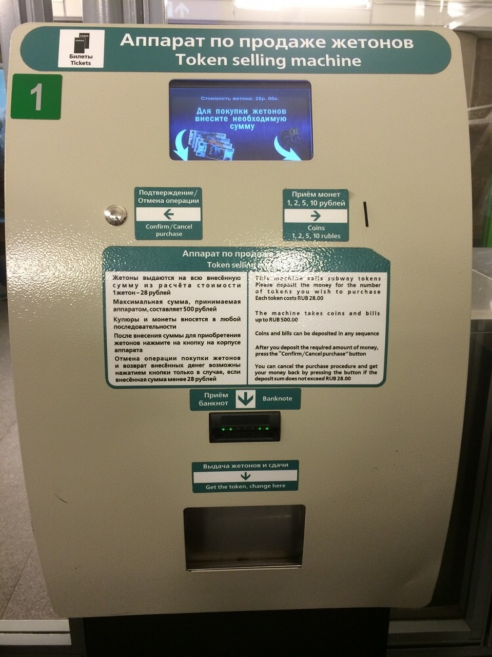 カードタイプの回数券もありますが、1回券はジェトン(コイン)を購入して改札機に投入します。ジェトンは28ルーブルで、乗り換えなどをしても変わりません。