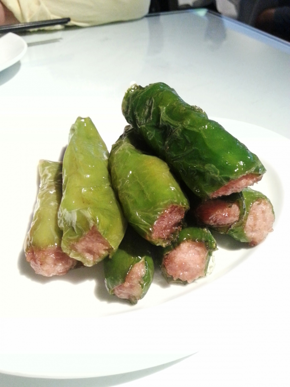 青唐辛子の中に鶏肉を詰めた「辣椒包肉」はビールに最高です!!