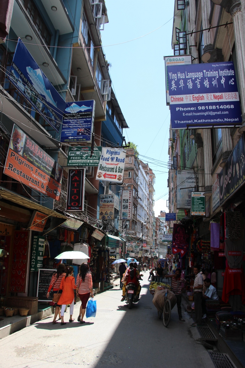 狭い通りには、安宿、外国人向けのレストラン、格安のアウトドアショップが所せましと並び