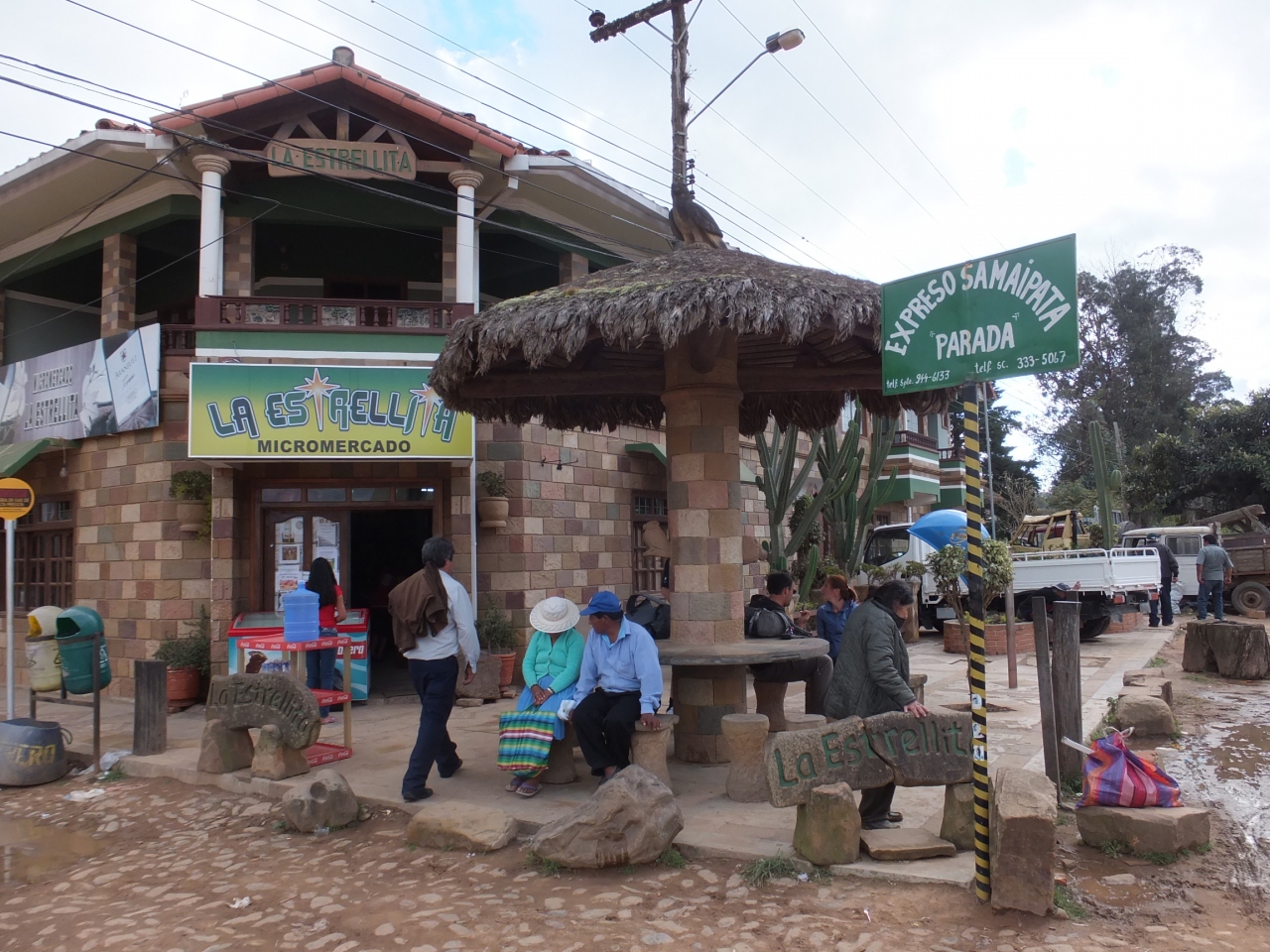 サマイパタからサンタクルスに戻る時は降りた場所とは異なり、幹線道路沿いに出発ポイントが有ります。いずれも片道Bs30です。タクシーは3~6人乗りで人数が揃うと出発します。20分も待てば大体揃います。