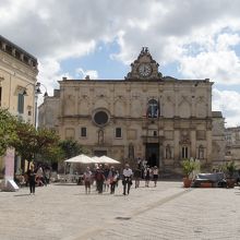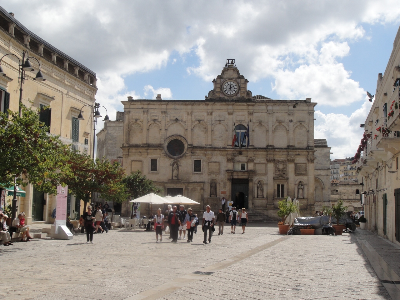 マテーラのメイン広場です。正面にはもともと神学校として建てられたランフランキ館(現在は美術館)があります。この建物のすぐわきには展望テラスがあり、サッシ地区の洞窟住居群が一望できます。周囲とは明らかにちがうその独特の雰囲気には、思わず息をのみます。