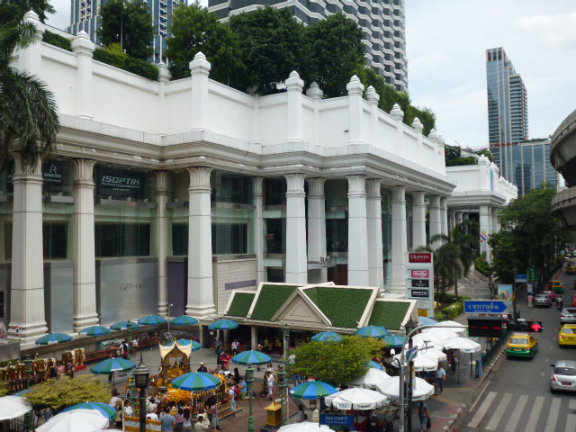 BTSのチットロム駅、北側に出ると多くの人のお祈りする姿がすぐ目に入ります。ここがエラワン梵天堂です。そのすぐ西側、大きくそびえるのがグランドハイアットエラワンホテルで、下層階にエラワンプラザがあります。