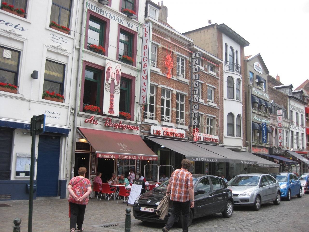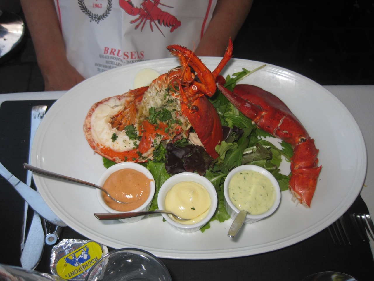 どの店もシーフードが売りで、伊勢えびやムール貝を食べる人で一杯です。