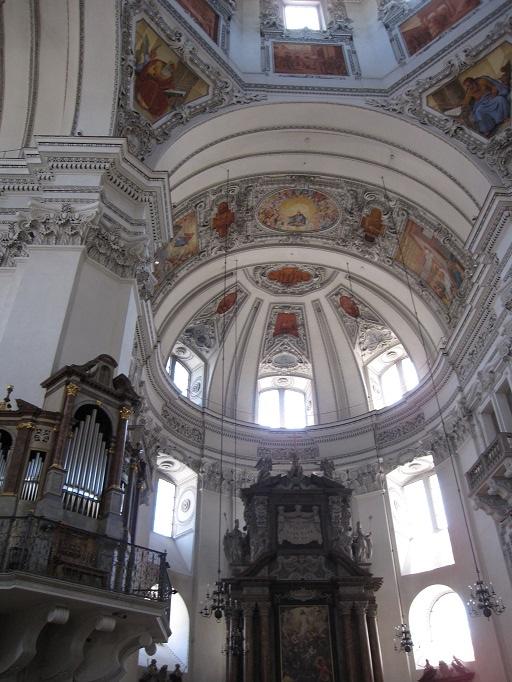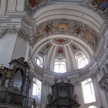この大聖堂は淡い色のフレスコ画が用いられ、白い壁とで柔らかな印象を受けます。モーツアルトもこちらで洗礼を受けたそうです。