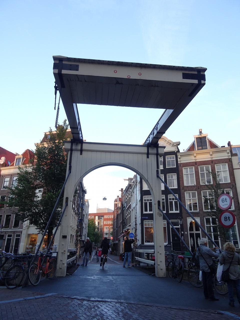 オランダ アムステルダム 「マヘレのはね橋」 夕闇に浮かび上がる姿は、幻想的でした。実際、はね橋は、オランダでも、ベルギーでもよく見かけました。現役の可動橋を見ると、建築学の粋を見る思いです。特に、このマヘレのはね橋は、夜のライトアップもきれいでした。