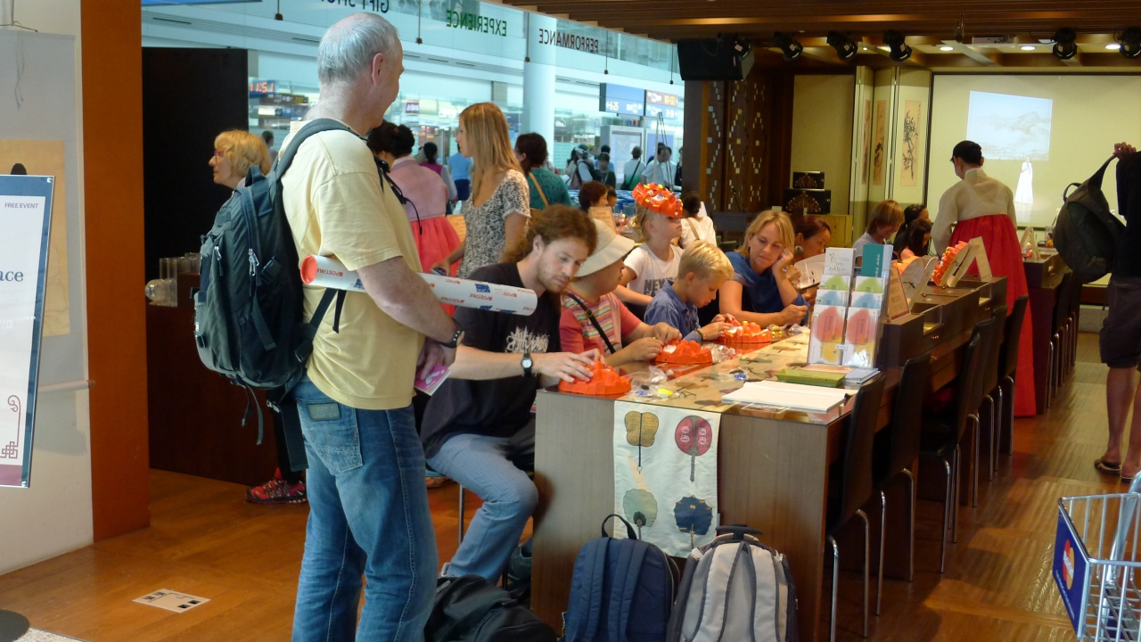 韓国のハブ空港である仁川国際空港は、訪問者を飽きさせずに、さらに自国の文化を上手く伝えようとする工夫が随所に感じられた。そのひとつがこの伝統文化体験館で、大人も子供も真剣になって工作に取り組んでいる姿を目のあたりにすると、少々悔しいけれど上手いなぁという感想を持った。オリンピックもあるので、日本の空港も学ぶべきことがあるんだろうなぁと思った。