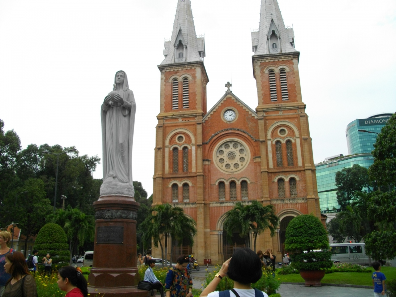 中央郵便局の西側にあって、いつも多くの観光客が教会前の広場に集まっている。正面から見ると、レンガ色の外壁に2つの白色の尖塔が空に伸びており、その形が綺麗である。また、内部にはいると、窓にはカラフルなステンドガラスが輝き、高い天井とともに、明るい雰囲気を醸し出している。4回ほど来ているが、いつみても美しい教会である。ベトナムでは一番美しい教会の一つであり、是非とも訪問し外観及び内部をみることをお勧めする。