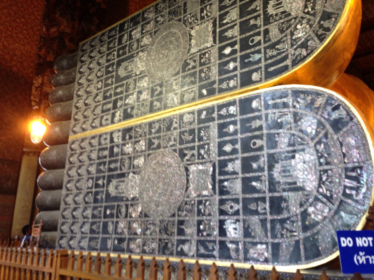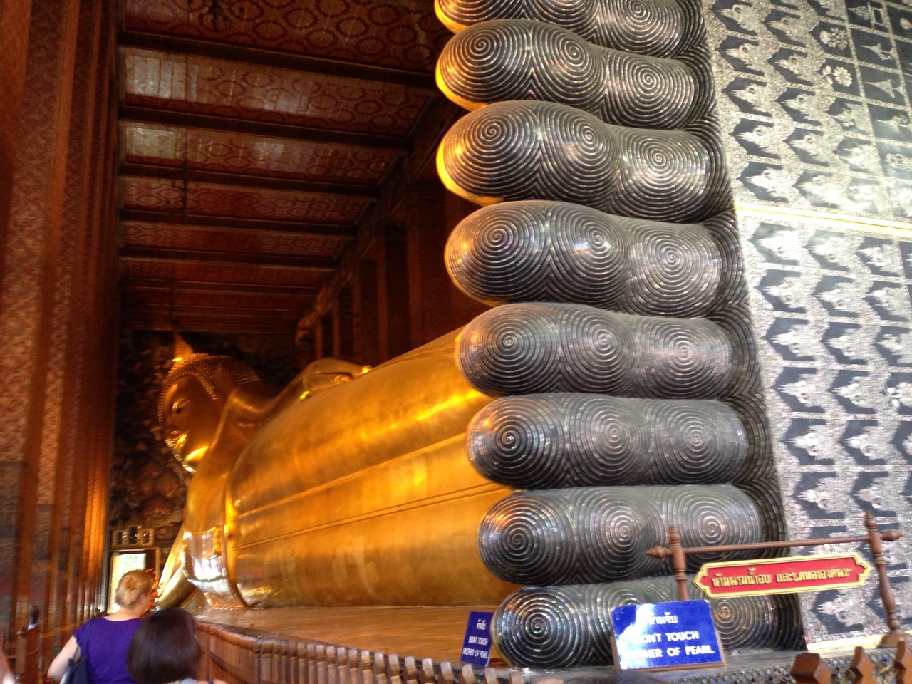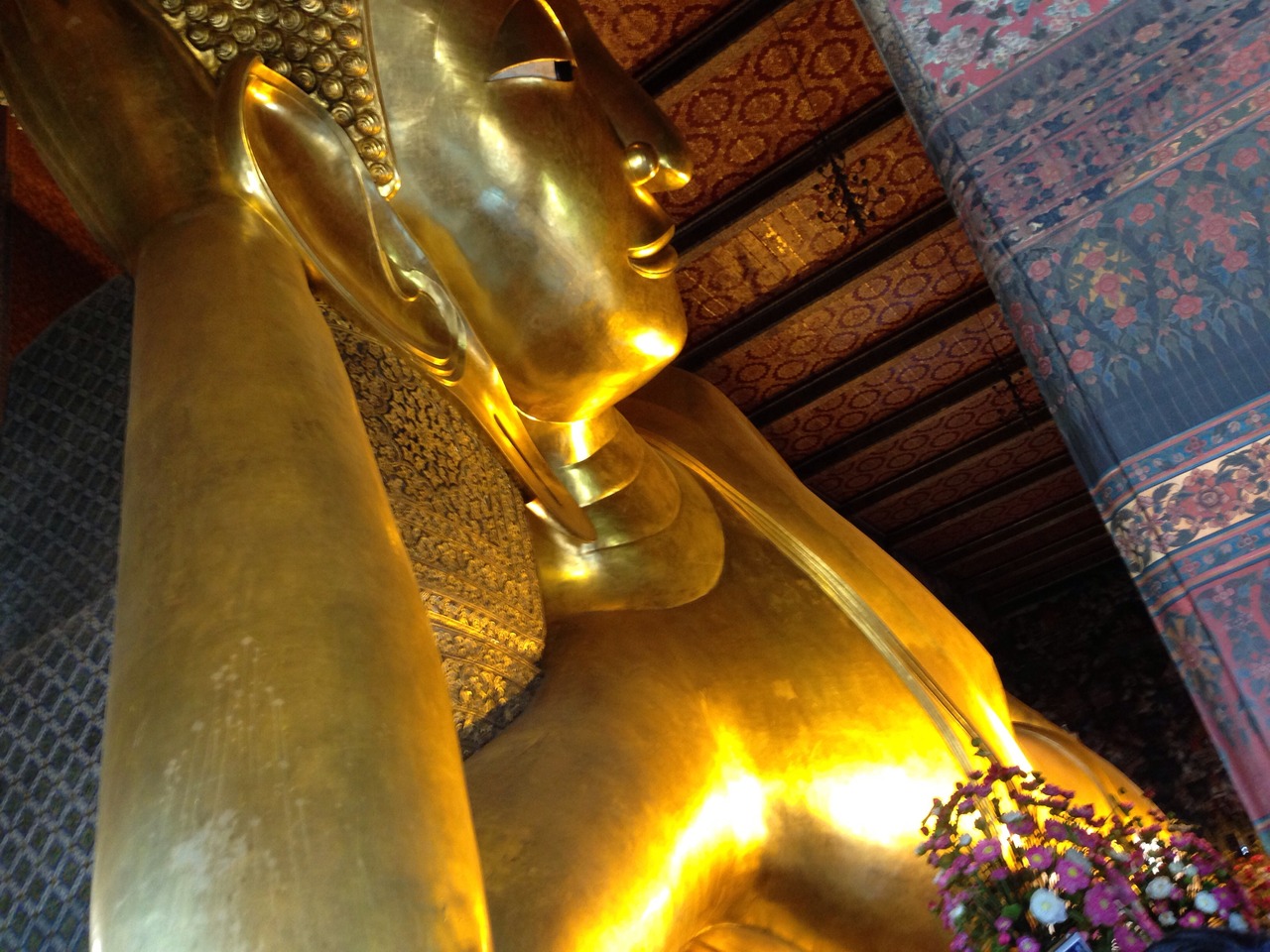 ガイドブックに必ず載っている巨大な寝釈迦像。ウマイかんじに写真に納めるのが大変です。