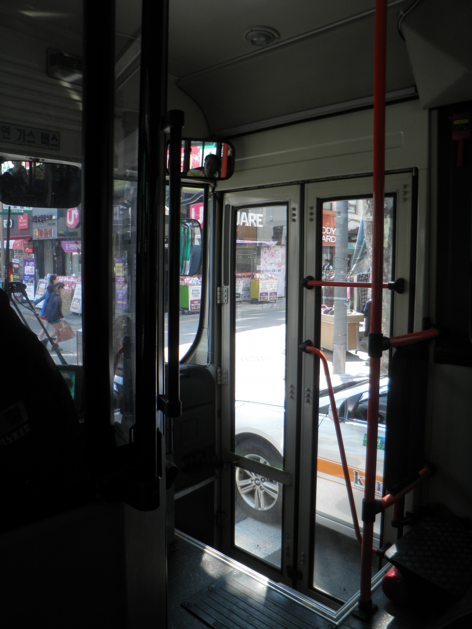 水原市は思ったより大きな街で、駅前のバス停から水原華城行きにいくバスはひんぱんに出ているようでした。バスの運転は日本にくらべると少し荒っぽいように感じました。電子マネーのTカードをもっていなかったので、現金で運賃を支払いました。