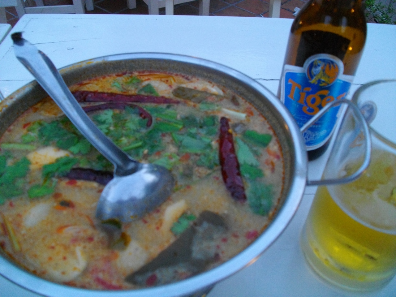 カオサンエリアで、トムヤムクンと美味しいお店というので行ってみた。レストランは、他の店横の狭い路地の奥にあり、敷地は広くテーブルが並ぶ。夜早めだったせいか、結構暑い。さっそくビールを飲みながら、トムヤンクンを食べた。トムヤンクンはまぁまぁ旨く、ボリュームもあるので、特に辛いタイ料理を好きな方にはお勧めしたい。なお、かなり辛いので、注文する時は、好みの辛さをスタッフに伝えること、また屋外での食事なので、涼しくなってから訪問することをお勧めする。
