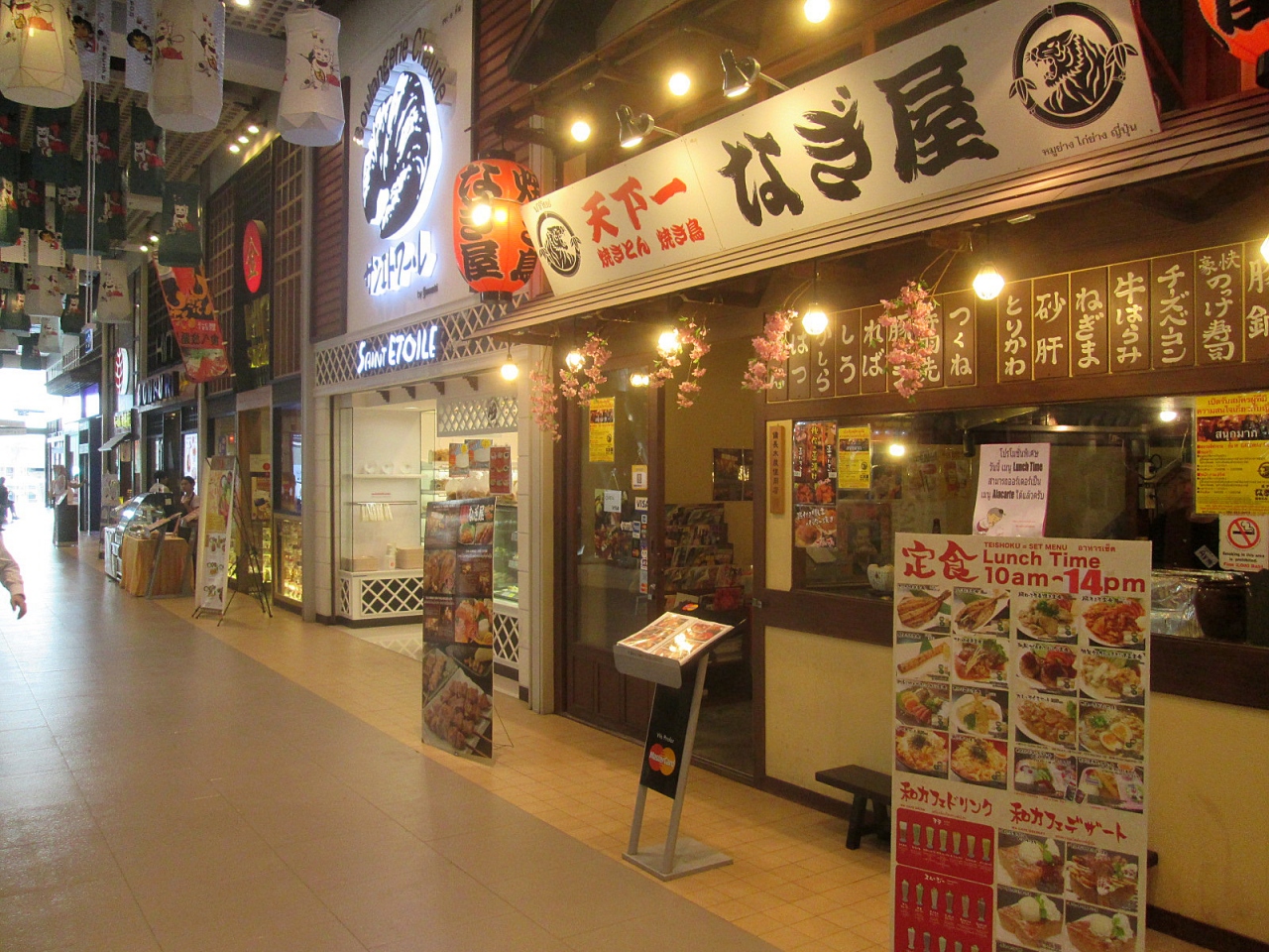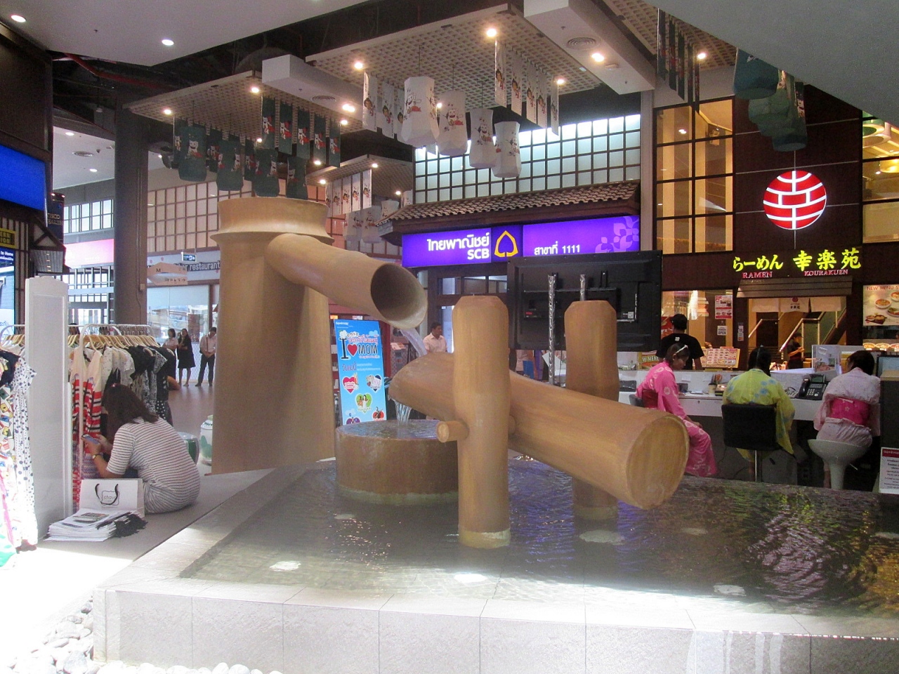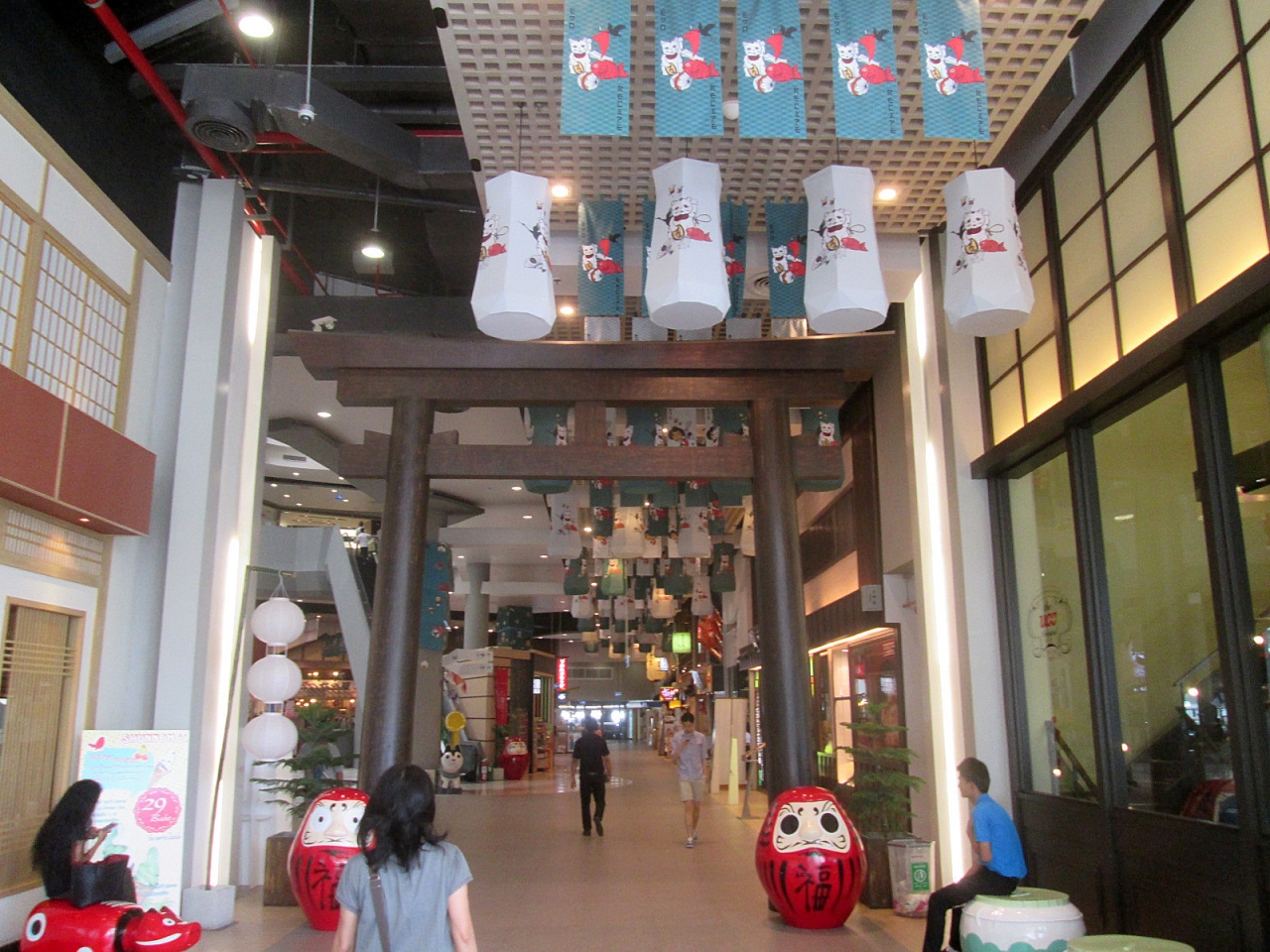 元々BTS「プロムポン」・「エカマイ」・「トンロー」周辺は、駐在員を中心とした日本人が多く住む地域です。そのBTS「エカマイ」に直結した「ゲートウェイ」は、いわゆる日本の”フード・テーマーパーク”のような場所です。何も知らず「エカマイ」駅からの連絡通路で「ゲートウェイ」に向かうと、入り口前には大きな招き猫や昔懐かしいオート三輪などが飾られており、「ここは何なの?」と思わせてくれます。建物に入ると大きな鳥居があり、その先に進むと”ししおどし”をモチーフにしたオブジェのある広場となっており、その広場を囲むように日本食レストランがずらりと並んでいます。レストラン以外にも日本のお菓子専門店やメイドカフェなどもありますし、インフォメーションデスクの女の子は浴衣姿、その脇には絵馬のオブジェと、まさにジャパニーズカルチャー及びサブカルチャーの発信基地といった雰囲気です。1階にも日本食関係の小店舗、また日本の雰囲気を持たせたフードコート(パッとしませんが…)、そして日本の市場をイメージしたような一角もあったりしますので、日本が恋しくなった人や日本にあこがれを持つタイ人にとって天国のような場所かも知れません。近年、タイを訪れる中国・韓国人客の激増の影響によって、各所に中国語やハングル文字が目立つようになり、相対的にタイにおける日本の影は薄くなったと感じています。こうしたビルの存在が日本復権の起爆剤になれば良いですね。