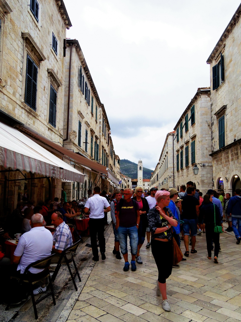 正面から入るとあるメインストリートになる大通りがプラッツァ通りです。観光客向けの土産物屋とレストランが並んでいます。観桜客だらけでゲンナリしました。中国人も多かったです。人が少なければきれいな通りだと思いました。