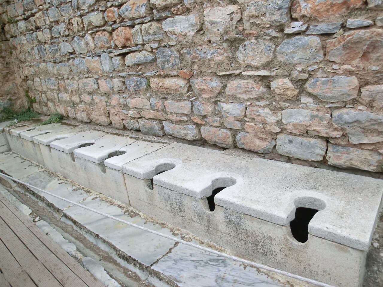 こんな遺跡が残っているなんておもしろいです。しかもこの時代に水洗トイレで大理石。冷たそうだし、隣との境がないのであまり使用したくありませんが。誰でもがする自然現象なのでおおらかだったのかもしれませんね。用を足しながらおしゃべりしていたのでしょうか?