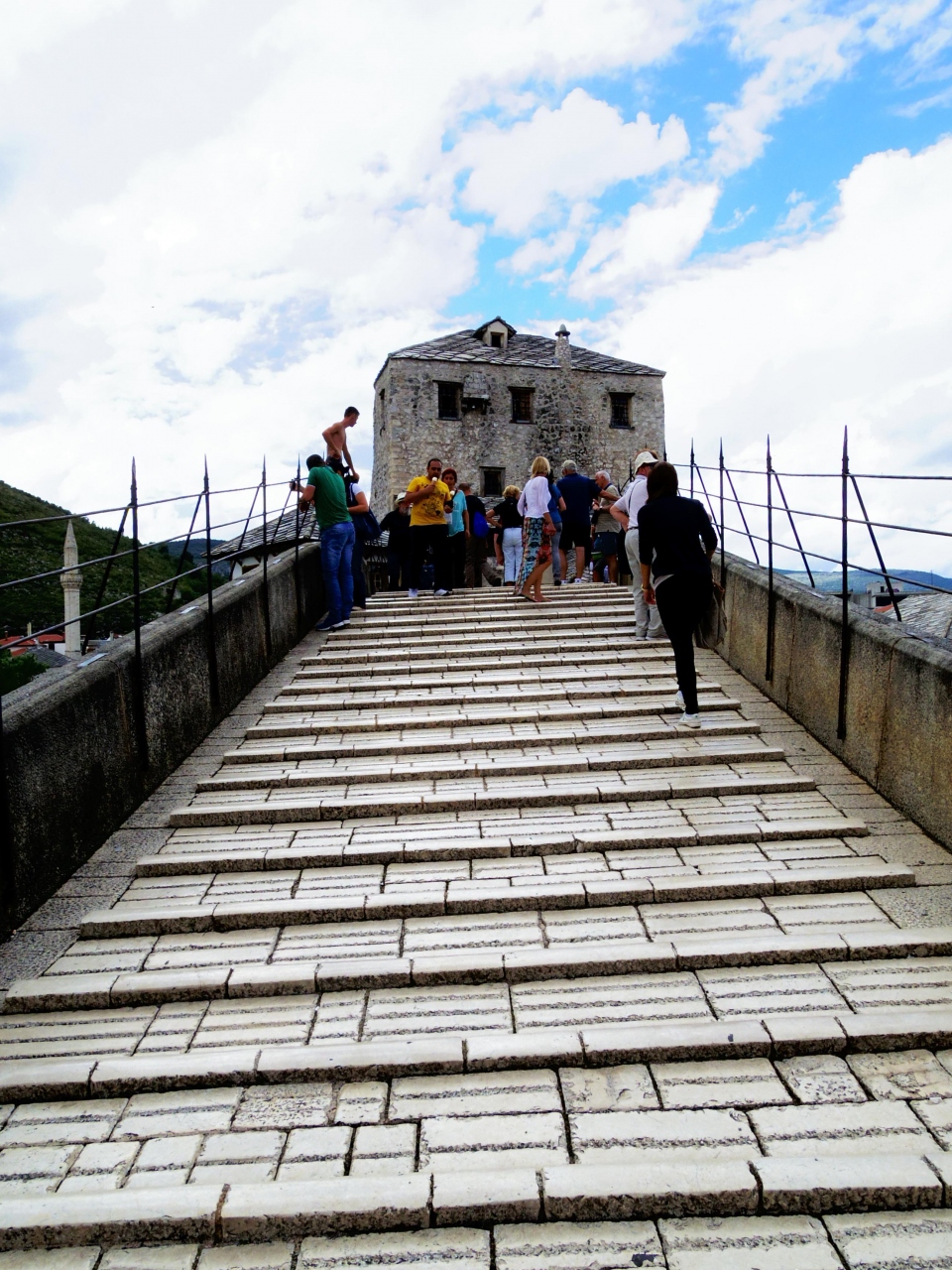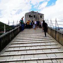 モスタルの街を象徴するのがネレトヴァ川にかかるスターリモスト橋です。橋は高さ20mほどあるそうですごく高く感じました。大理石でできているため雨の日はツルツルすべりました。当時の建築技術の高さをしめしています。
