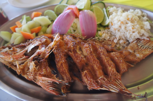 タイを丸ごとあげてくれて、野菜やライスなどをトルティーヤに包んで頂きます。