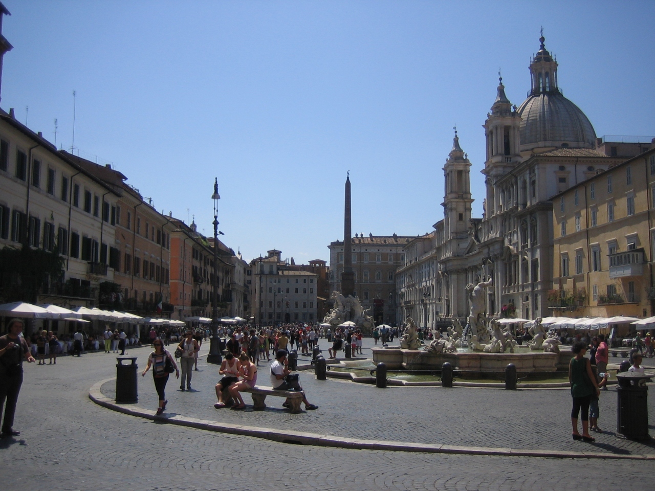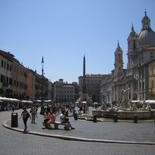 車の入り込めない街中にあり、細長い広場になっています。広場の東側にはレストランなどが並んでおり、観光客だけでなく地元の人もカフェや食事を楽しんでいます。四大河の噴水など美しい三つの美しい噴水があり、造形美が楽しめます。ただ、人が多いのでスリなどにはご注意ください。