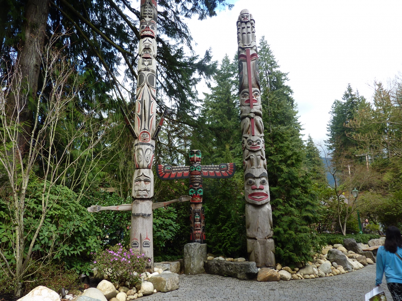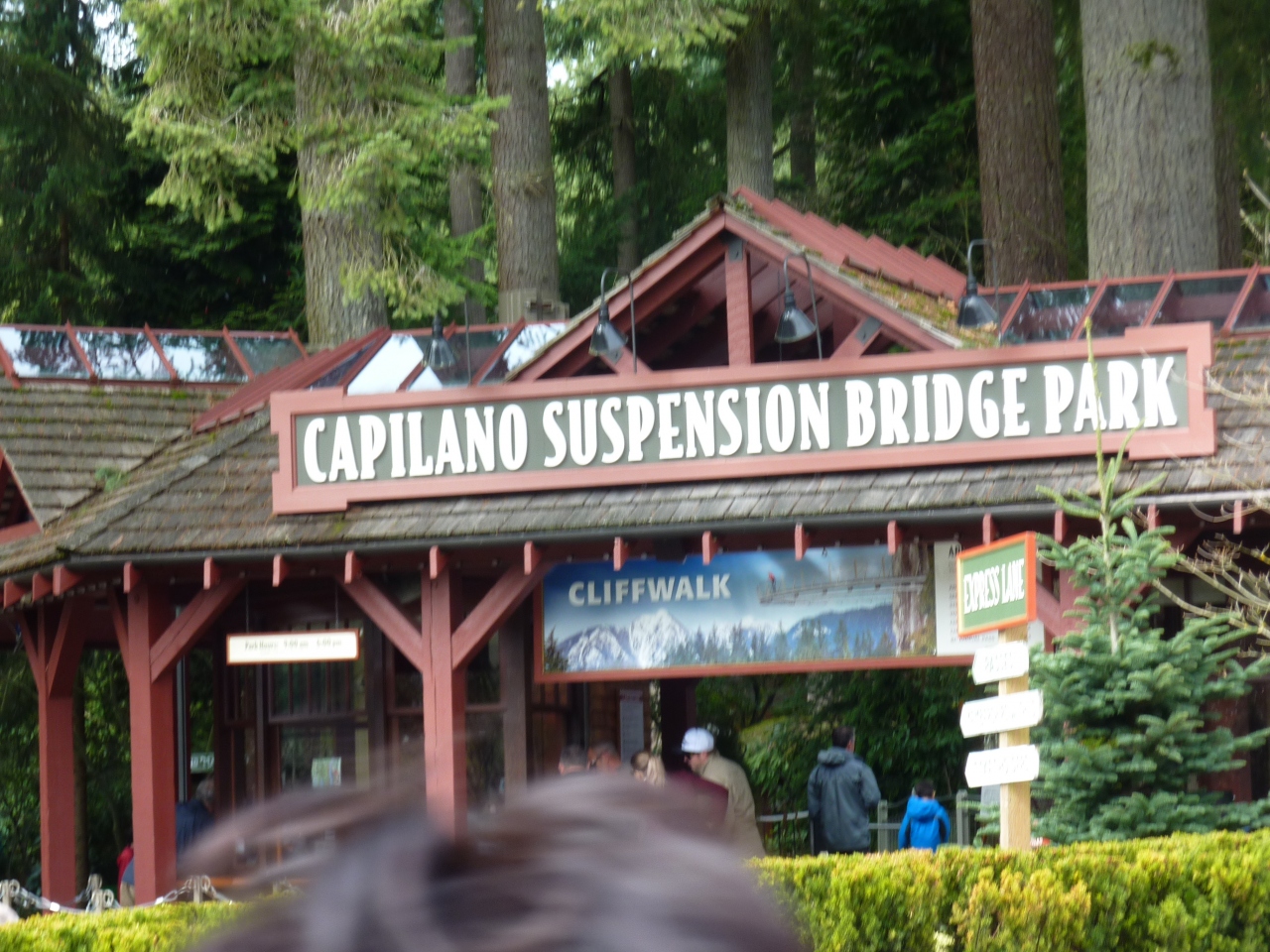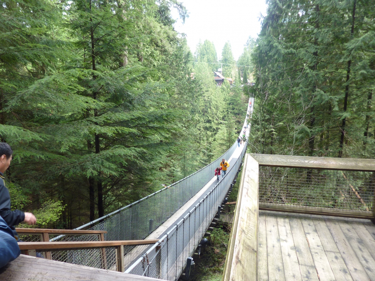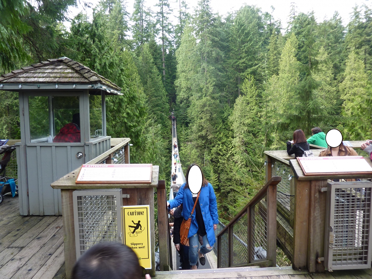 水上バスでロンズデール・キーに渡り、そこから定期バスで15分程で入口に着きます。トーテムポール広場を過ぎて、ギフトショップの前に吊橋があります。木製の階段を数段降りた所から太いワイヤーで吊られた橋になります。大人3人位の幅で、吊橋上の何処かで誰かが、揺すります。板張の路面でフェンスの高さは1m以上ありますが、吊下った橋を歩くのは高所恐怖症の人には苦しいです。3~4分で渡れますが、途中で立ち停まって谷底の景色を見るのも良いです。渡り切った所にベンチがあり、小休止できます。吊橋から先は森の中です。坂道あり、樹上のボードウォークあり、川沿いのビューポイントを回ることもできます。自然のままに管理された森林を見る事ができ、バンクーバーの自然を味わえます。