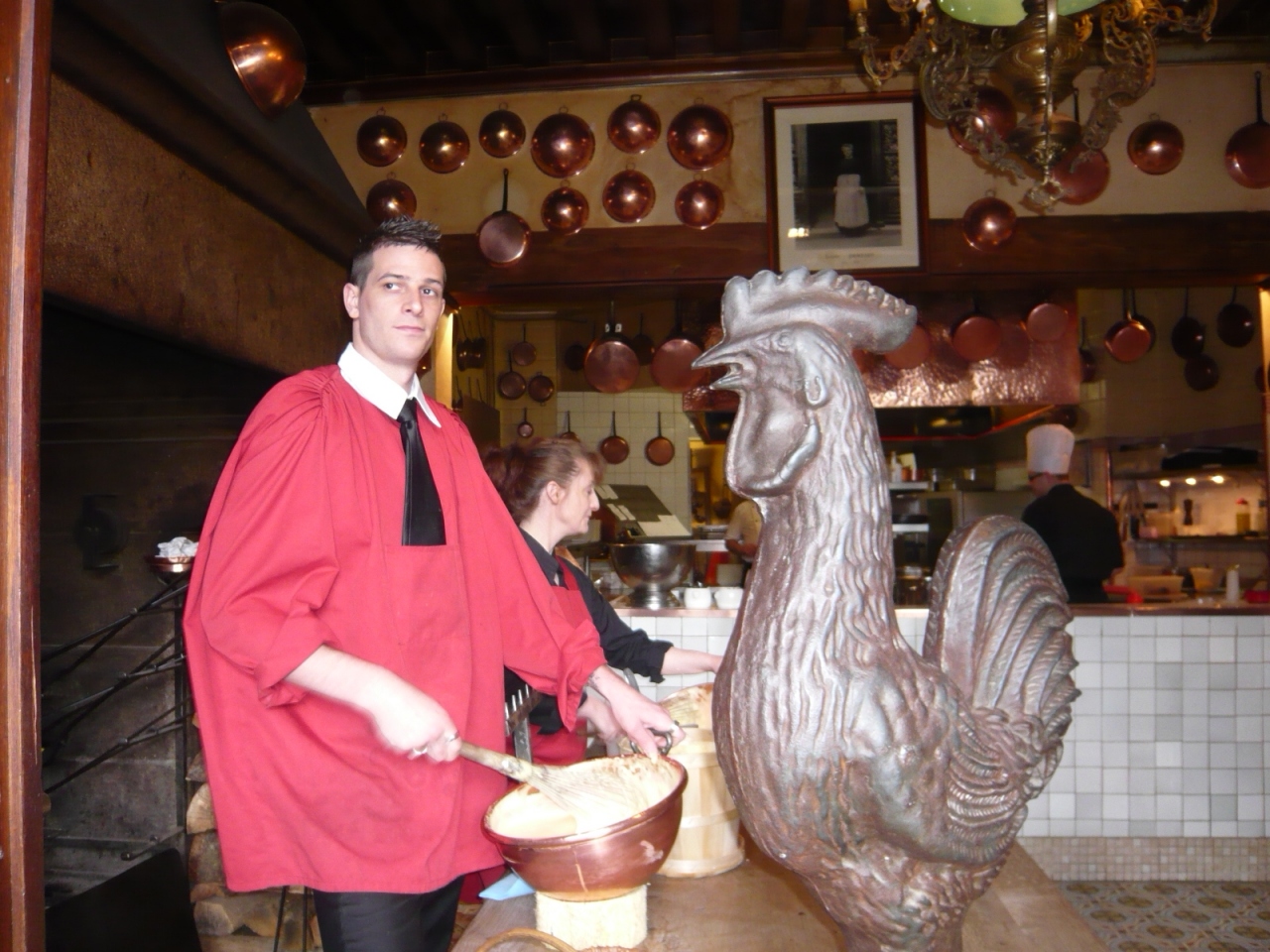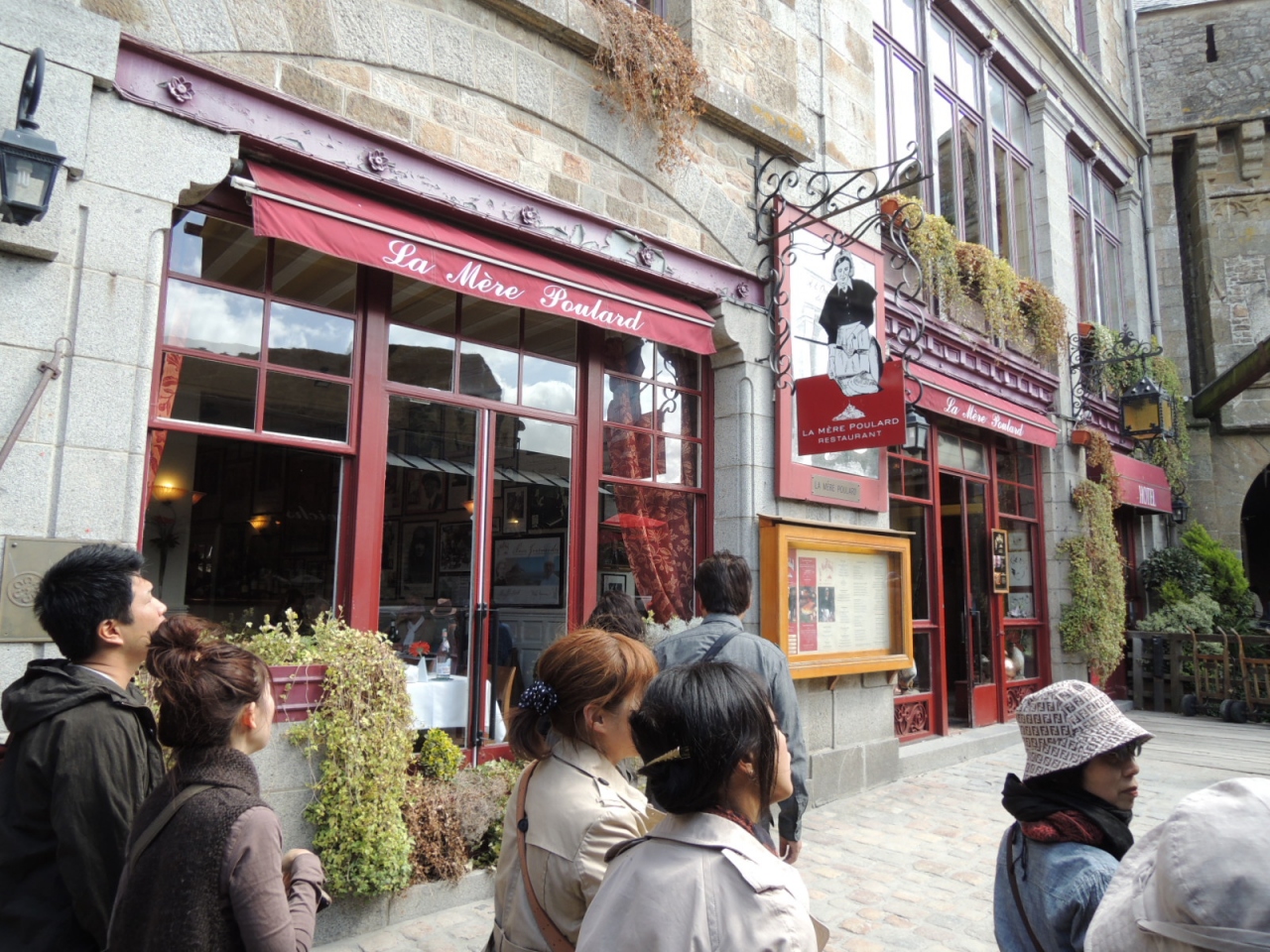 19世紀に巡礼者の宿泊施設として開業した宿である「ラ・メール・プーラール」。階段の壁に掲げられた著名人の宿泊写真に歴史を感じます。通りからレストランの厨房がのぞけて、ここの名物であるスフレのようなオムレツの材料となる玉子をリズミカルに泡立てているところが見物できます。赤いスモックに黒いボウが粋ですね。