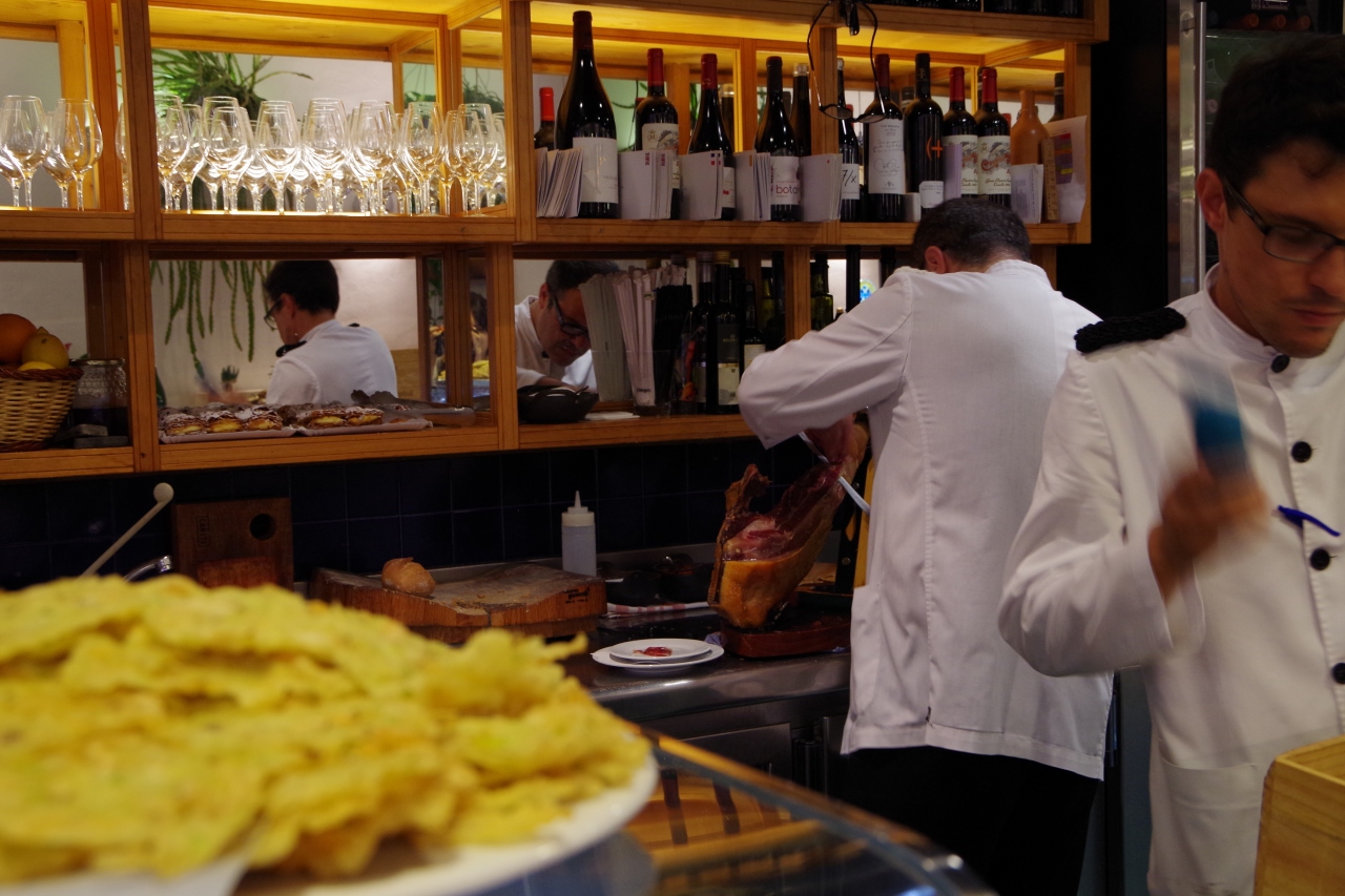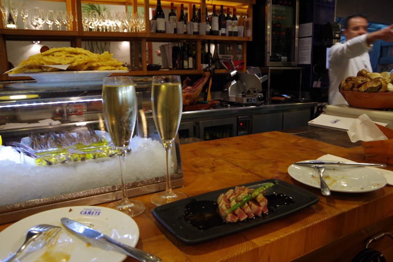 パンコントマテ、ハモン(少ないほう)、おすすめされたマグロを焼いたもの、アヒージョ、カバ、二人で食べてお会計は10,000円以上でした。