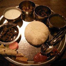 ネパールの数いる民族のなかでタカリ族とは料理上手な民族として知られており、彼らの作るダルバートはうまい!と定評があります。もちろんこのレストランもタカリ族経営です。外観からして少しおしゃれで芝生の庭にあるテーブルで食事をしたら気持ちよさそうです。店内も落ち着いた感じでムードがあります。各種カレーもありますがやはりここはダルバート。この店のメニューではThaliとなっています。Thakali Plain Thali(200Rs)からSpecial Thakali Non Veg Thali(420Rs)まで5種類ありますがThakali Veg Thali(250Rs)をオーダー。Thaliの中の1品がCurd/Panner curry/Egg Curryの中から選べたのでCurd(ヨーグルト)にしました。一言で言うと豪華。タルカリ(おかず)やアチャールの種類も多くダルも抜群の美味しさでした。もちろんおかわり自由、お腹いっぱい食べられます。Non Vegの場合はチキン/マトン/フィッシュの中から選べます。