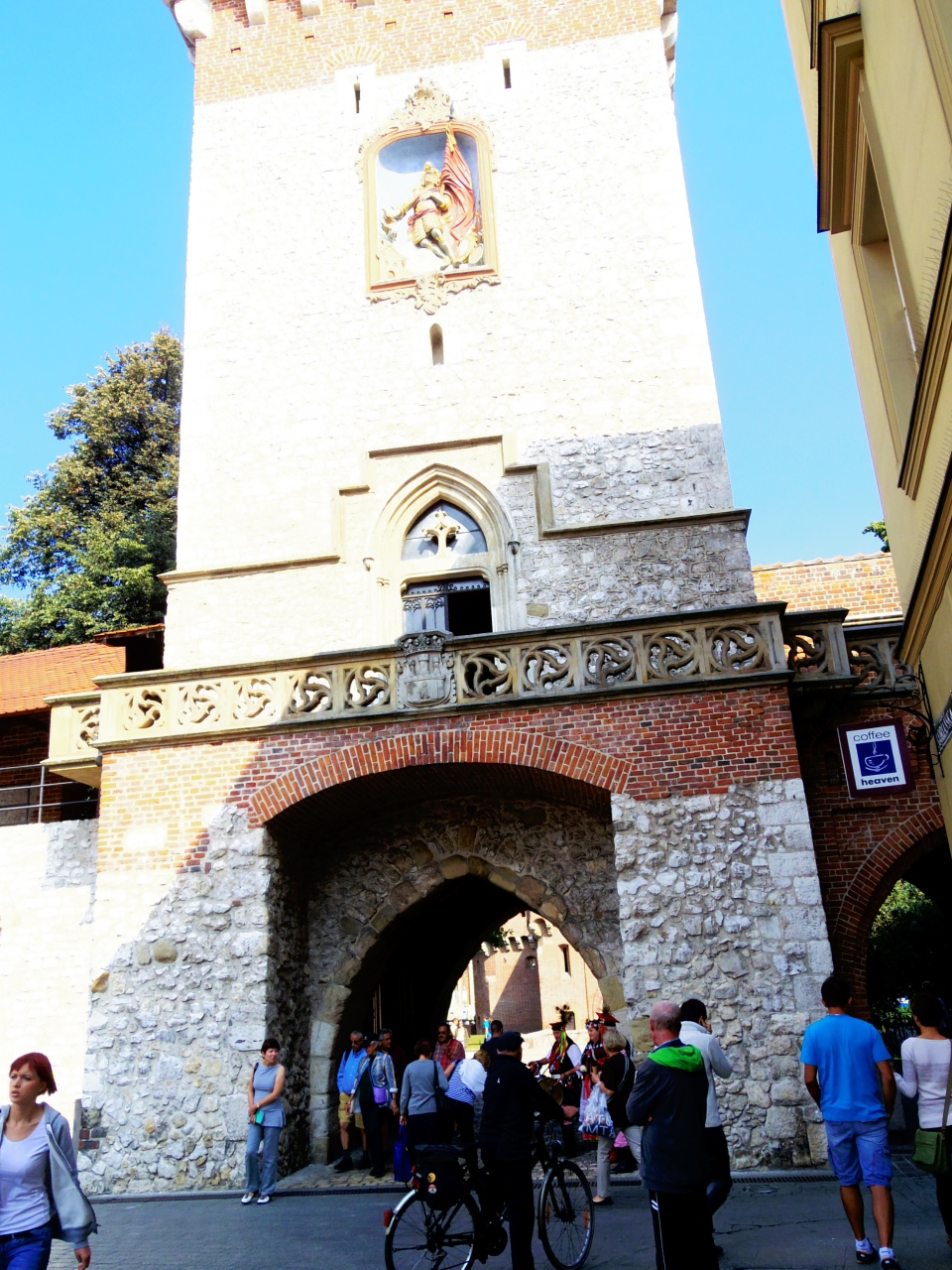駅やバスターミナル方面から来て旧市街に入るときに正面の門になります。そのままメインストリートに通じるのでいつも人通りが多いです。フロリアン門の手前にはバルバカンという名の昔の要塞の跡が残っているのでわかります。