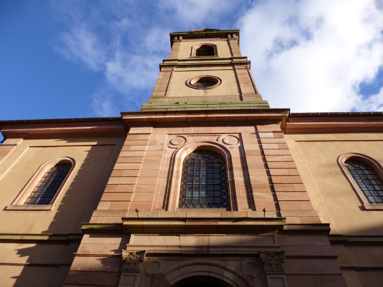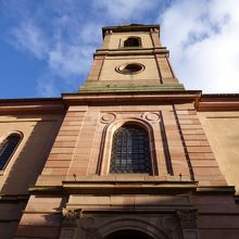 プロテスタント教会はメインストリート終点のドルダーの塔を正面に見て、右側にある教会。左側にカトリック教会がある。時計塔が高くすぐにわかった。中を見る事ができなかったのだが、外観からガラスはステンドグラスではなくシンプルなタイプだった。