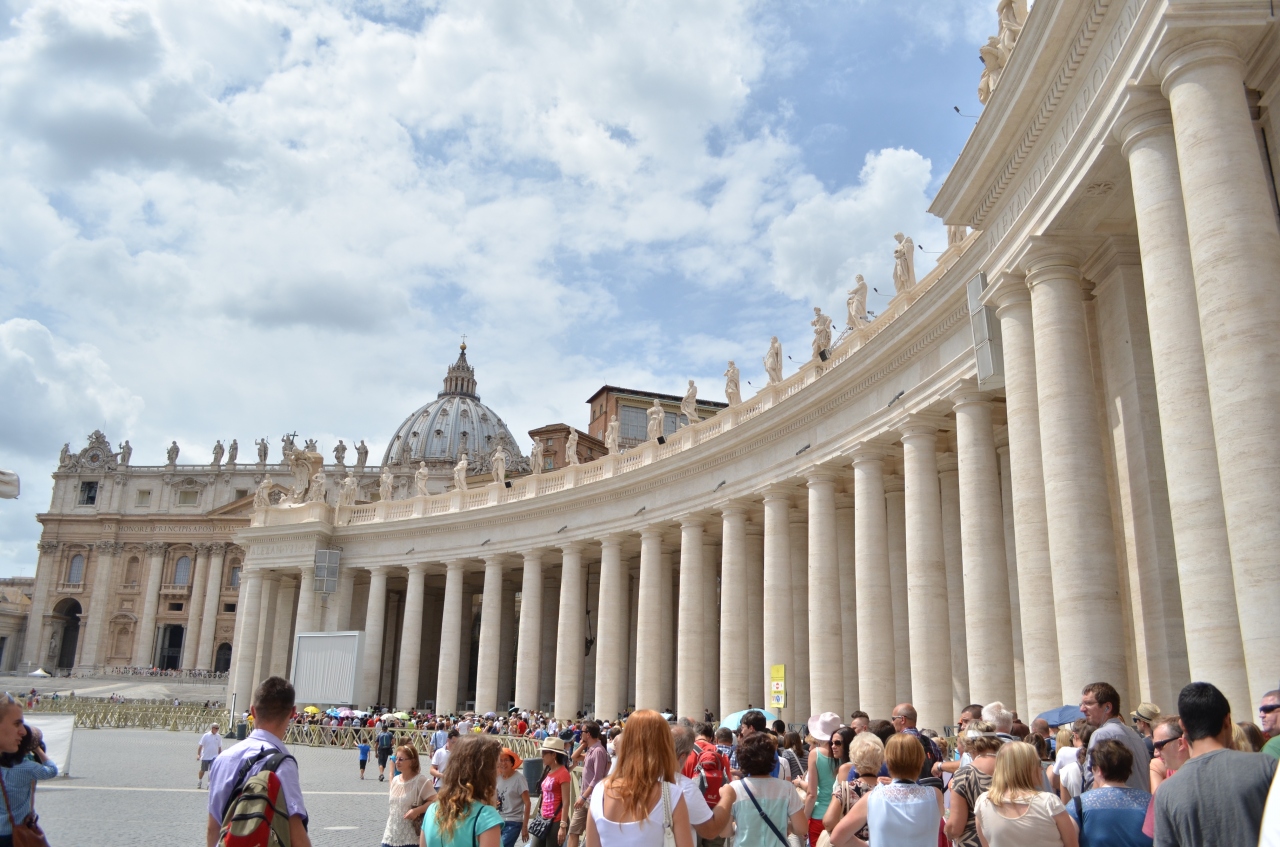 サン・ピエトロ大聖堂の手前にあるサン・ピエトロ広場。左右がシンメトリーとなって、実に美しい。映画「天使と悪魔」をご覧になった方は、映画のシーンが脳に思い浮かぶでしょう。284本の柱と140体の聖人像、その壮大な光景はまさにキリスト教カトリックの総本山って感じがします。映画のファンはぜひ天使の顔のレリーフ「ウエスト・ポネンテ」を探してみてください。広場の中央に立って、パノラマ写真を撮ってはいかがですか?