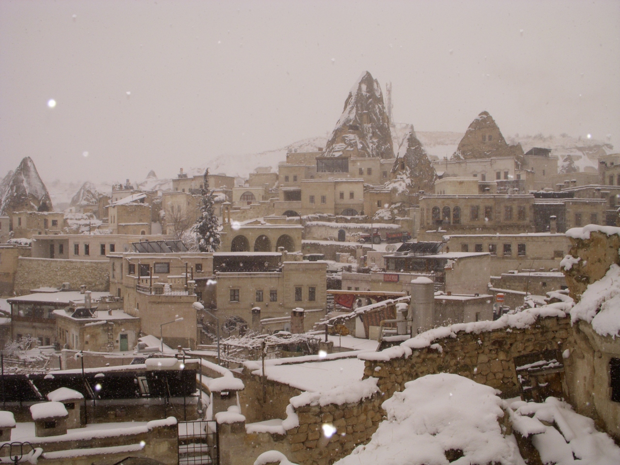 きのこ岩と違ってただ単にとんがったギョレメがあるのですが、ホテルの従業員のかたから眺めが抜群にいいと言われたので、スタッフの案内で連れて行ってもらいました。緑の草原地帯もいいですが、雪の真っ白な景色もまた味わい深いものでした。