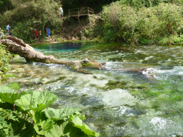 細い木の橋を渡ると下は川底まで見える綺麗な川。