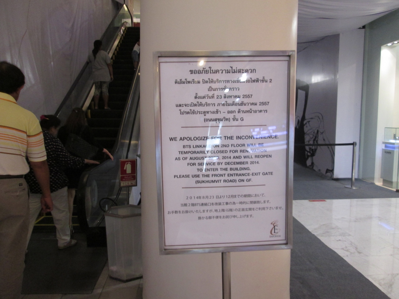 8月から12月までかなり大がかりな改装工事を行うようです。3階にBTSとの連絡通路がありましたが、8月23日から閉鎖されています。少し不便ですがスクンビット通り側の1階エントランスから入店することになります。9月に訪問したら20%から30%程度のお店が改装しているようでした。
