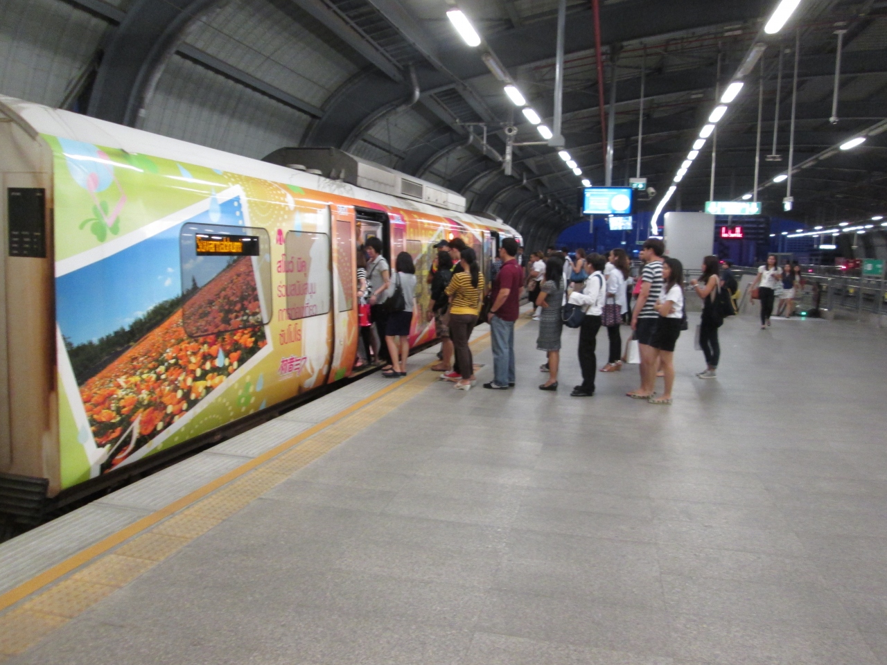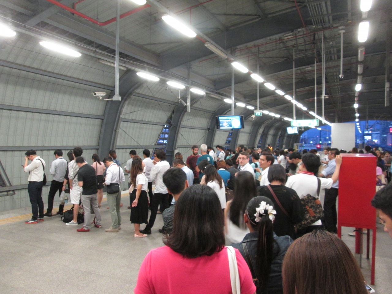 マッカサン駅からシティーラインを利用してスワンナプーム空港まで移動しました。通勤ラッシュ時間帯と重なり駅ホームには大行列が出来ていました。途中駅なのでシティーラインもある程度満員の状態で到着し、結局、1本目は乗車できず2本目の電車にようやく乗車できました。