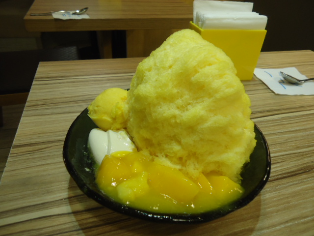 台湾と言えばマンゴーかき氷と言うことでアイスモンスターに行って来ました。店に入ると一人、最低110台湾ドルを注文しないといけませんでした。マンゴーかき氷は一個でも量が多いので二人で分けて食べようと思ったのに残念でした。