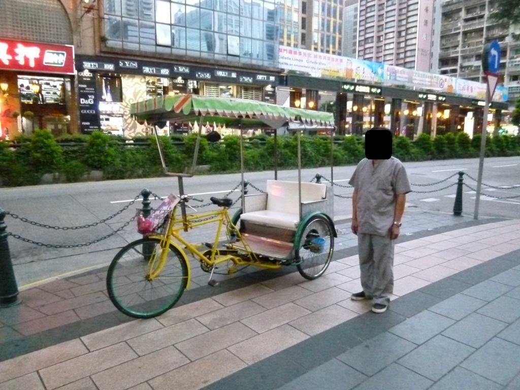 マカオは小さな島国で電車がないので、主にバスやタクシーでの移動となります。しかし、見逃してはならないのは、人力三輪車(ペディキャブ)ですね。いわゆる、チャリンコタクシーです。リスボア付近でお客を待っています。この様な乗物には北京や上海などで乗ったことがありますが程良い風が入り快適でした。マカオへは数回訪問していますが、いまだ乗車していません。次回は乗りたいと思います。