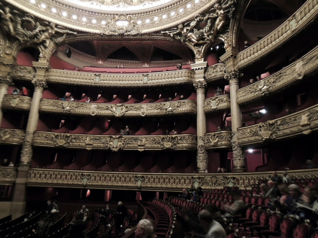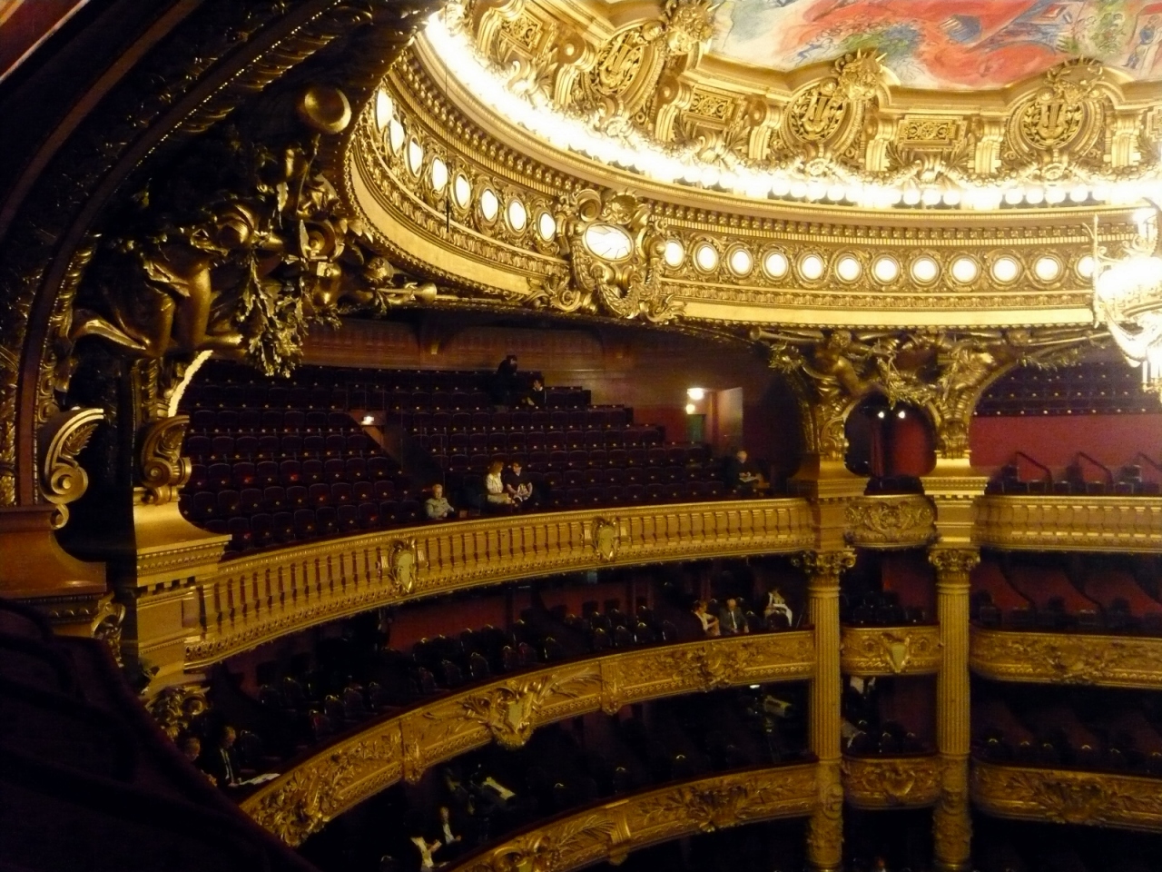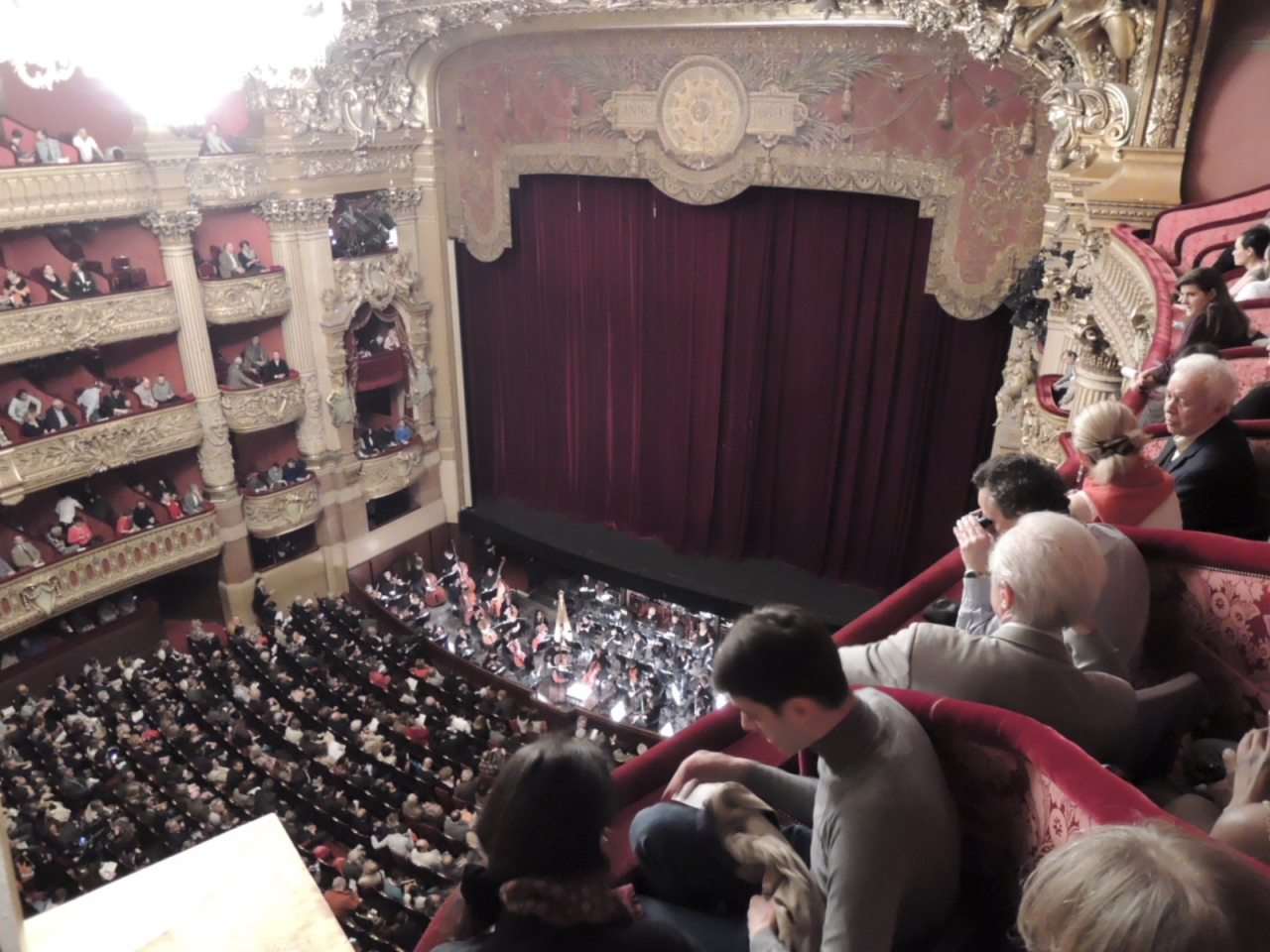 午後7時半開演なので、その前に内部を探検して時間をつぶしました。広い大理石の階段が左右に分かれているホールから入って、赤と金で飾られたバルコニーを持つ2000席余りの観客席をのぞきまわり、上から下からいろいろ舞台を見ました。今回は最上階、5等級の席でひとり25ユーロ(約3300円)、上から舞台を見下ろす形になります。最前列の人たちは身を乗り出して首を右に向け見続けることになりますが、私達の席は正面に舞台が見える引っ込んだ席だったので楽でした。オペラグラスは必需品です。5階席は最上階だけに目の前にシャガールが手がけた天井画「夢の花束」と7トンのシャンデリアがありますエッフェル塔やオベリスク、凱旋門等、パリが描かれている素晴らしい天井画です。