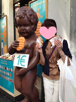 小便小僧までには、チョコレートやビール、ワッフルやさんなど、ベルギーらしいショップがたくさん並んでいて、街歩きには最適です。なお、小便少女はグランプラス反対側の飲食店街(なんとか横丁的で、個人的には興味深々なエリア)を通り抜けたところにあります。一緒に居ないのね・・・