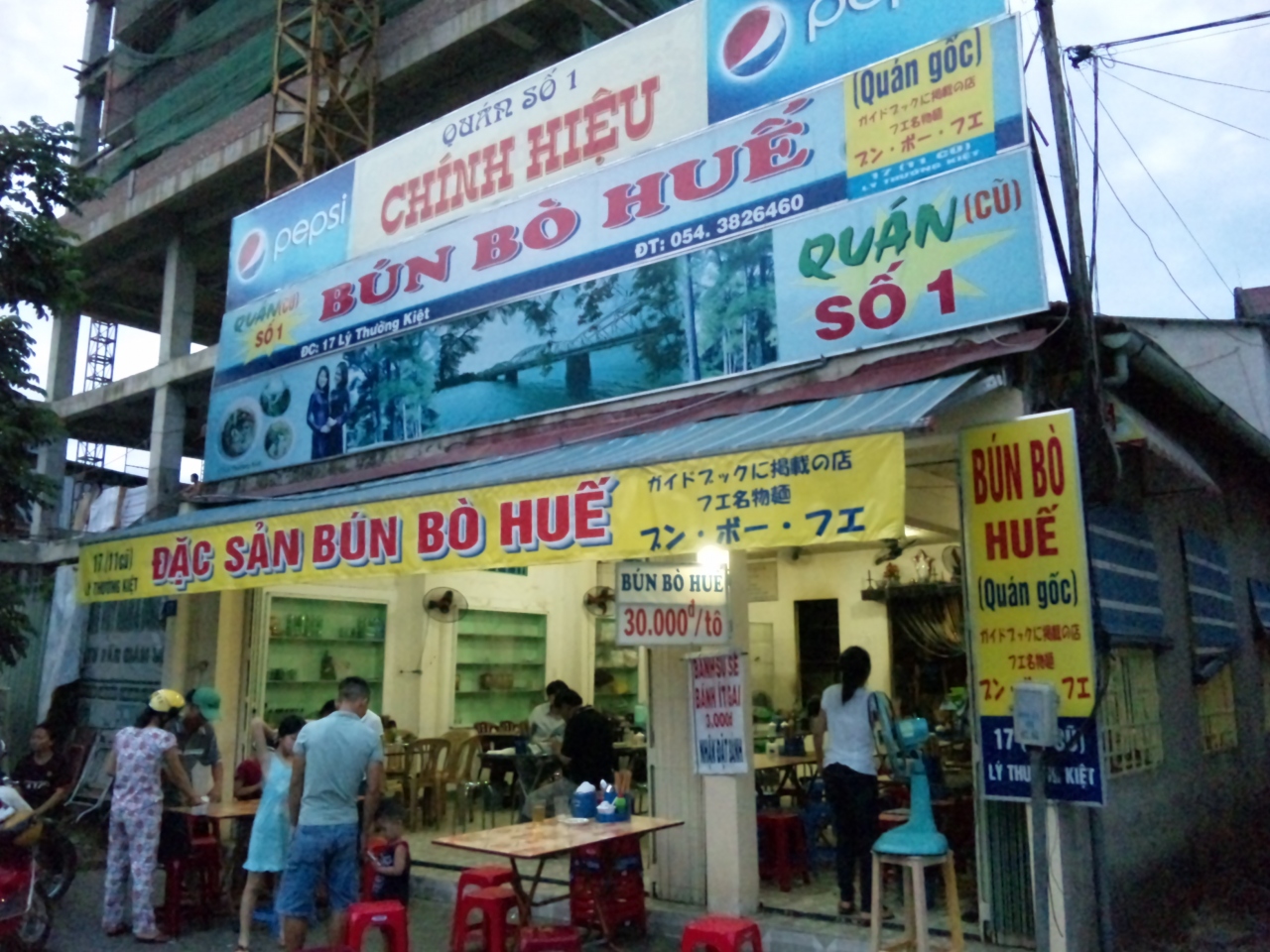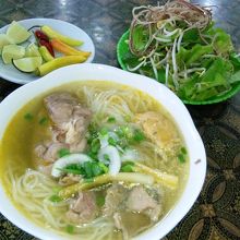 フエの繁華街からは少し離れたところにあります。フエヘリテージホテルがこの近くにあり、目印とするとよいでしょう(同じ通り沿いにあり、少し離れていますのでご注意を)。ブン ボー フエはフエの名物の麺なので、フエに行ったら食べることをおすすめします。看板に日本語の表示もあり観光客も来るのでしょうが、私が行ったときはローカル度100%でした。麺とともに野菜や香辛料が出てくるのでお好みでいれるといいでしょう。具もたくさん入り、見た目よりもあっさりしておいしかったです。このお店でなくてもいろいろな店にあるので食べ比べるのもよいでしょう。料金はブンボーフエ25000ドン、500MLの水が10000ドンでした。