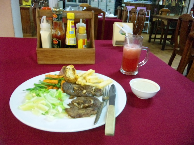 国道13号線沿いにあるので場所はわかりやすいと思います。店名にもあるコーヒーは飲まなかったのですが、ステーキがボリュームもあっておいしかったです。肉は厚切りではないのですが、野菜やガーリックトーストの付け合わせもあり、おなかがいっぱいになりました。何よりこのステーキのソースがおいしかったです。オーダーは紙を渡され、お客が記入する形式でした。ステーキ30000KIP、スイカシェーク6000KIP、水(中)3000KIPで安いです。メニューも豊富だと思いますので、洋風料理が食べたいときは訪れるとよいでしょう。
