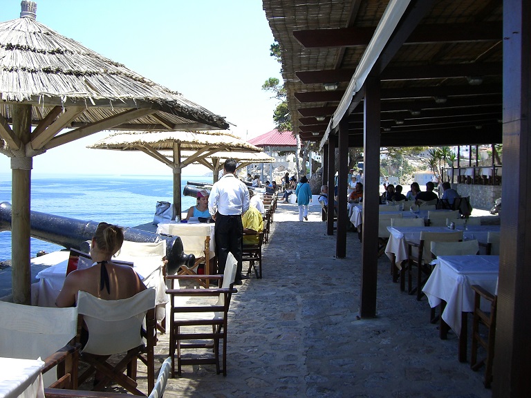 下船後、「ロバのタクシー」には乗らず、港の周囲と街の路地を散策しました。港には、ヨットより漁船が多く停留し、「青い海」「パステルカラーの邸宅」とうまく溶け合っていました。港の外れまで歩くと、海辺のレストランがあり、その近くで気持ちよく水泳を楽しんでいる人達の姿に出会った。また、海辺のレストランの一角に歴史を感じさせる砲台が残ったままであったのもめずらしい光景であった。