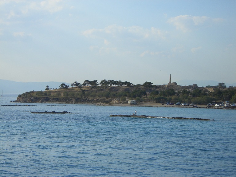 クルーズ船が港に近づくと左側に遺跡、右側には港町が見える。