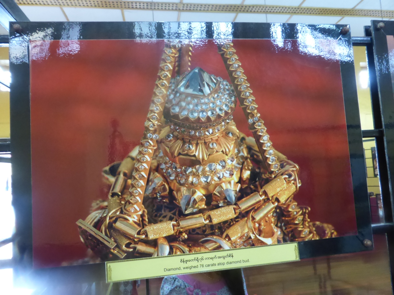 タクシーで東門から入場。靴を脱いで裸足で中に入らないといけないがチケット売り場で靴を預かってくれる。境内は広くバゴダは金ピカで壮大。一部外国人禁止の場所あり。境内に望遠鏡がありバゴダの頂上に寄付で集まった宝石をみることができるようになっている。