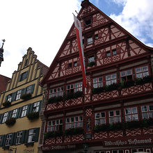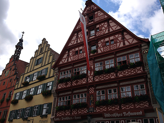 ディンケルスビュールで一番有名な建物が、このドイチェス・ハウスです。1440年代の建物で、7層の美しい木組みの造りが中世そのままといった風情と風格を醸し出しています。各階がひとつひとつの箱になっていてそれを積み重ねるスタイルの構造となっています。上の階に行くほどに大きく、斜めから見ると上に行くほど前に突き出しているのが分かります。現在はホテル兼レストランとして利用されています。