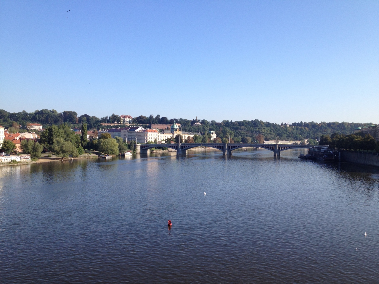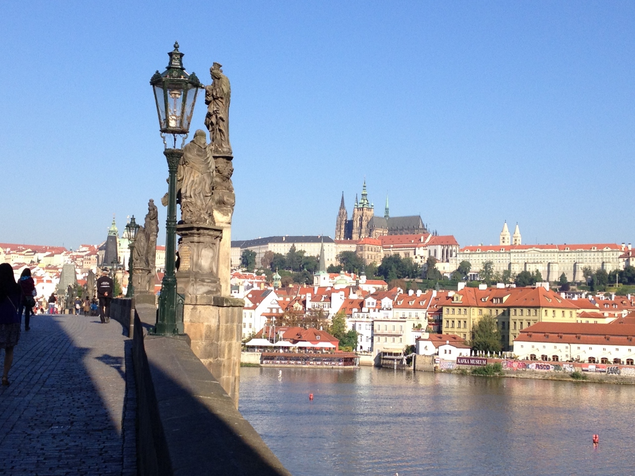 旧市街広場から西へプラハ城に向かい歩くこと約10分、プラハの名所ヴルタヴァ川にかかるカレル橋がみえてきます。優雅に流れる川をみているだけで癒されますし、西にプラハ城、その手前のオレンジ屋根の街並みは見応えがあります。橋の両脇には聖人像が立ち並び、ストリートパフォーマーや似顔絵書き、お土産物屋が出てとても賑やかです。ただ、時間帯によっては世界各国からの観光客でぎっしりですので、私は朝早くまだ人もまばらな時間帯での訪問をお勧めします。