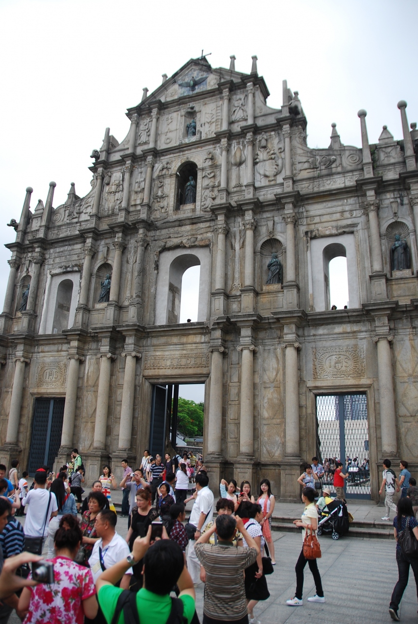 マカオの世界遺産の一つです。近くに行くまでは奥行きがある建物だと思っていましたが、正面に建ったら、うすっぺらでびっくり!正面のファザードには,素晴らしい彫刻が刻まれています。また、階段を使って上に登れるようになっています。